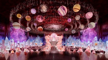 设计灵感来源于珍珠和玉石,珠玉的形成需要大自然的鬼斧神工,如同相爱的新人相遇是天意所为,珠玉良辰宴会厅是奢华和富丽堂皇的迪拜风格,创意来自迪拜王室造价3亿美元的婚礼现场,大厅造价2500万,其中吊顶就占400万。装饰有9999颗珠子,寓意永恒的爱情。